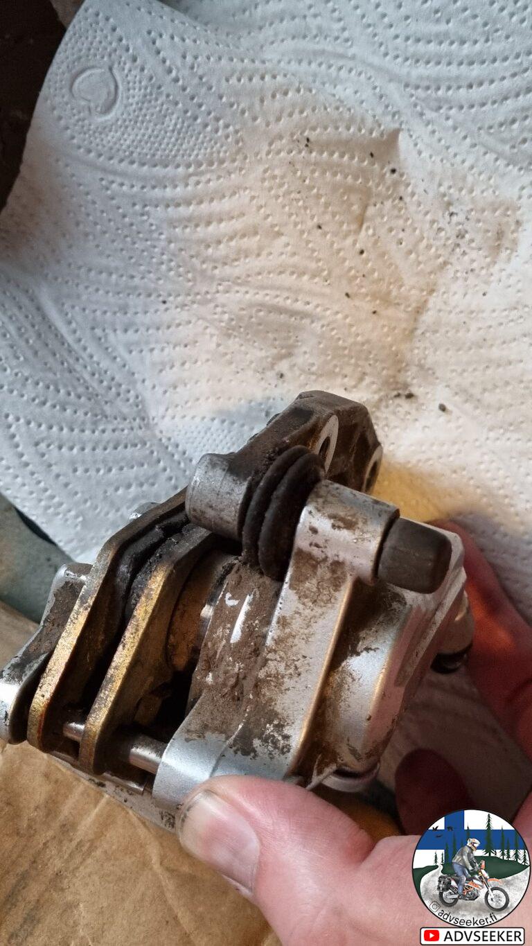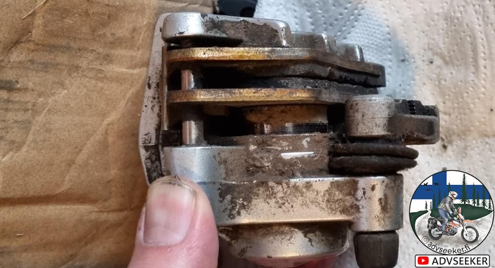 Irroitetaan jarrupalat ja puhdistetaan satula brake cleanerilla ja hammasharjalla. Männät voivat olla melkoisen tiukalla. Itse käytin paineilmaa painamaan männät pois. Tekniikan näkee tästä youtuve videosta: https://youtu.be/ZoOh0h-YsO4?t=228