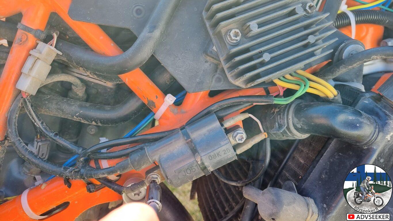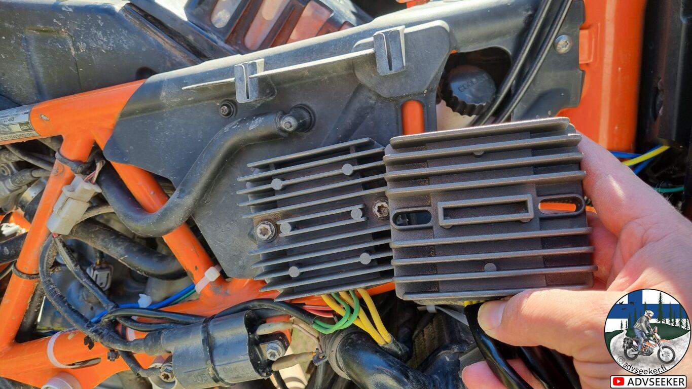 Korjaukseksi pitäisi siis hankkia uusi jännitteensäädin ja mieluusti MOSFET tyyppinen. Netissä oli paljon suosituksia FH008 ja FH020 malleista, mutta kumpaakin piti modata ja tehdä johdotukset uudestaan jos niitä haluaisi käyttää. Gooletellessani vaihtoehtoja eteen tuli Carmo electronics CARR694-KTM 690 950 990 MOSFET Voltage regulator rectifier. Tämä säädin on täysin plug and play eli mitään johtoja ei tarvitse säätää.