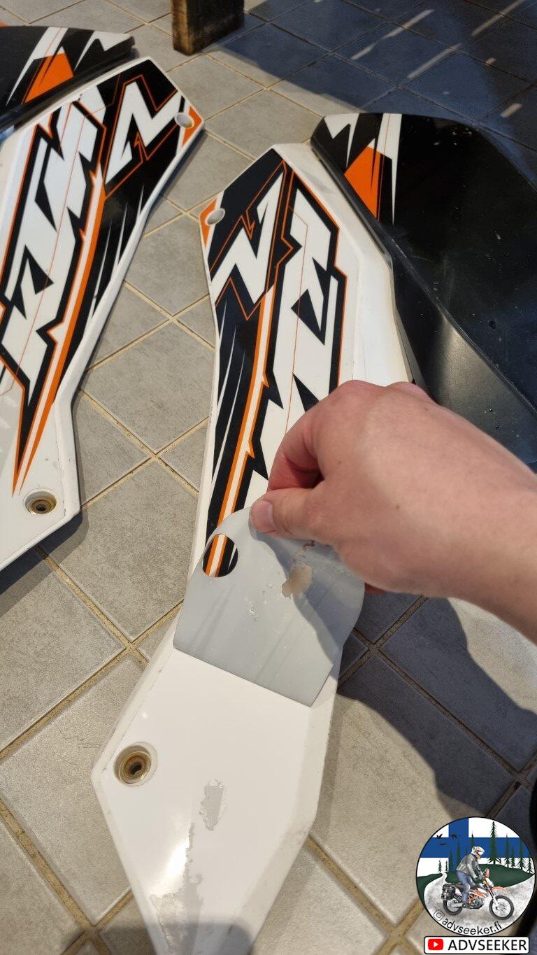 Kuumailmapuhaltimella tai hiustenkuivaajalla lämmitetään katteita ja irroitetaan vanhat tarrat pois. Itsellä katteisiin jäi melkoisesti liimaa vaikka kuinka koitti lämmitellä joten onneksi kaapista löytyi liimanpoisto ainetta jolla liimat lähtivät suhteellisen kivuttomasti. Sen jälkeen pesin katteet huolellisesti.