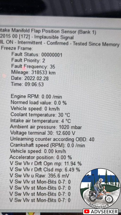 Jonkin aikaa sitten moottorin vikavalo syttyi. Tämä oli ensimmäinen kerta missään omassa autossa kun tämä kaikkien tuntema valo syttyy. Onneksi itsellä on VCDS vikakoodi lukija jolla on helpotto selvittää mikä autoa vaivaa. Joten lukija kiinni ja vikalistaus esille.